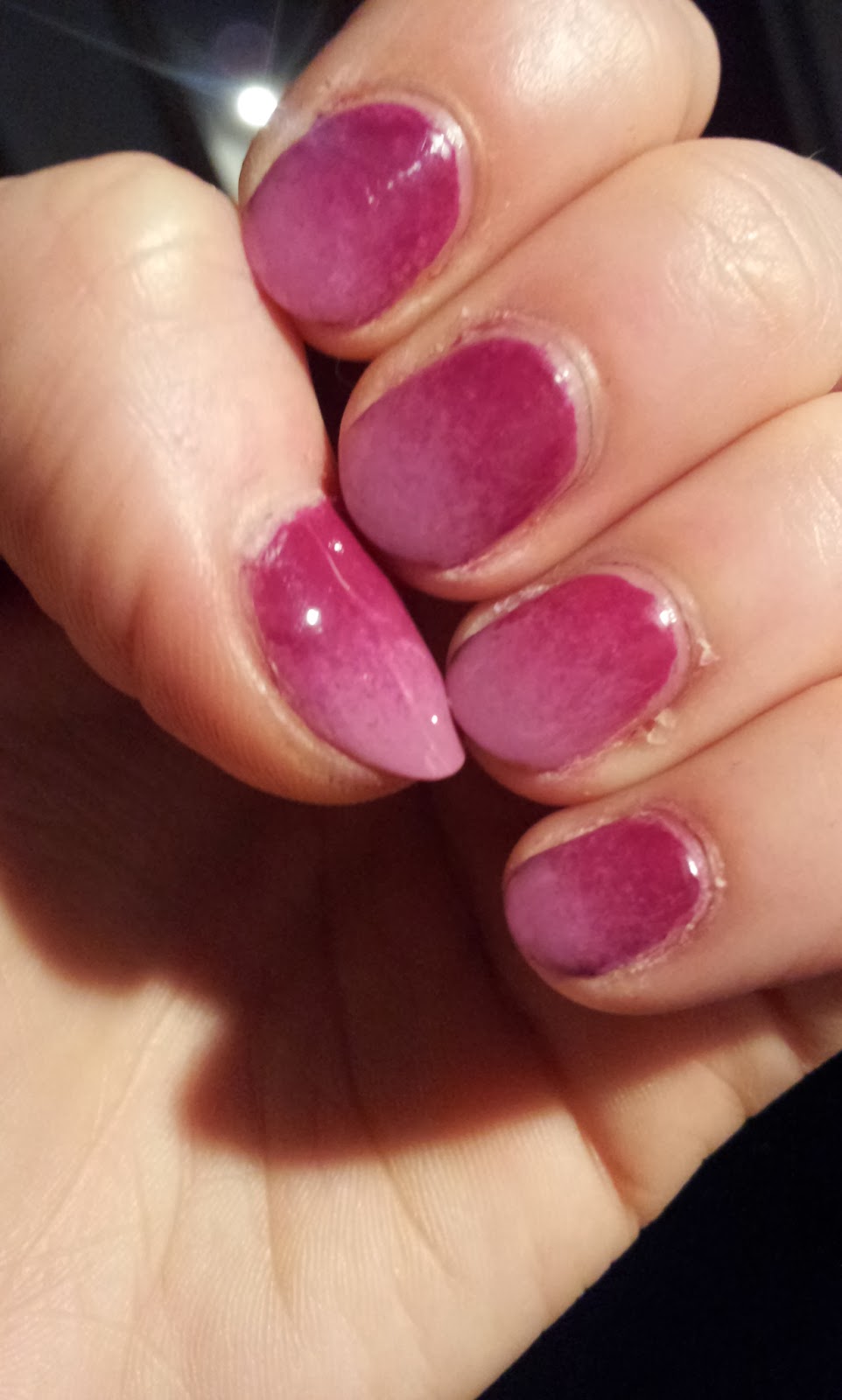 Of course at this point I remembered that I threw out all my makeup sponges. Not to be deterred I nicked a bit off the end of a washing up sponge. This goes part way to explaining why it's a rather course gradient lol. Still it's an improvement on my last attempt (several months ago now, time flies!) so that's something :). The colours don't appear to have names but they're both from the aforementioned technic set. X